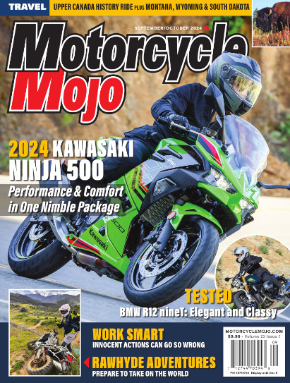 In this issue we bring you test rides on Kawasaki’s new 2024 Ninja 500 as well as the 2024 BMW R12 nineT, a bike that celebrates 100 years of motorcycle excellence. We bring you a report on RawHyde Adventures courses to see how this genre of riding opens up a whole new world of travel. Our travel features include a history ride along an area once known as Upper Canada, and exploring the mountains passes and national parks of Montana and Wyoming, and the the Black Hills of South Dakota.
