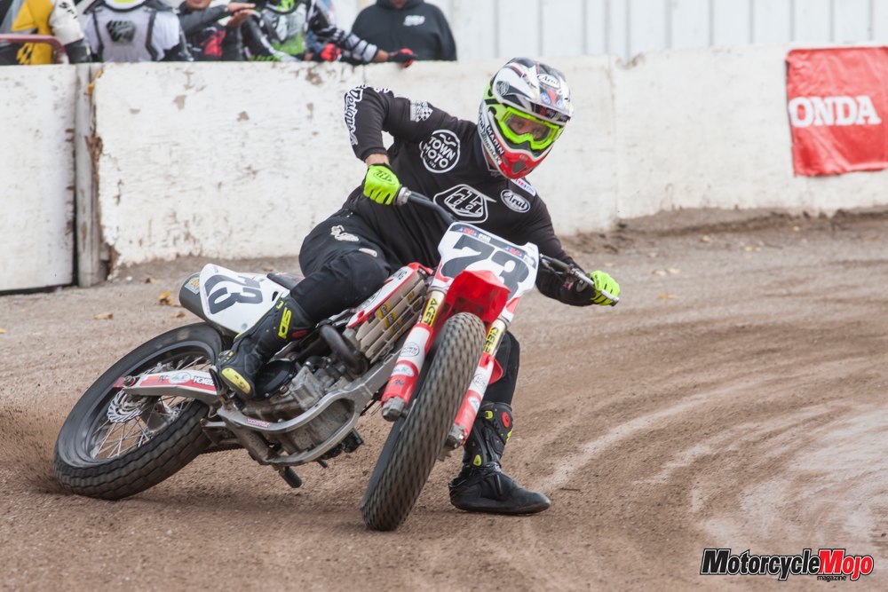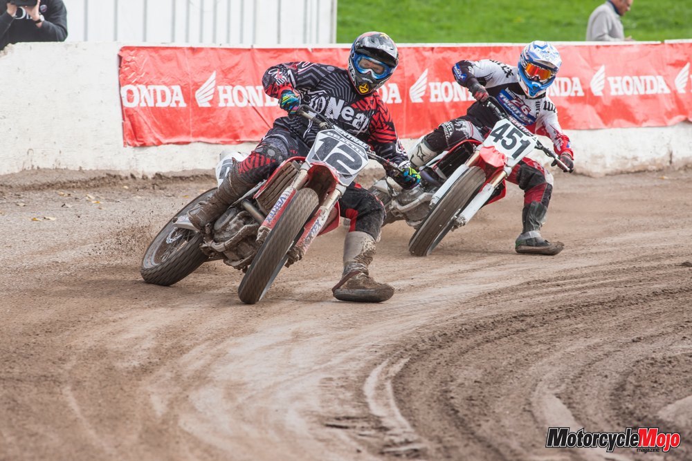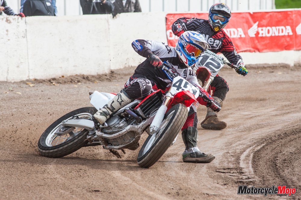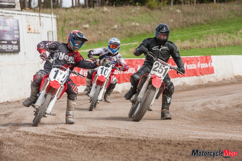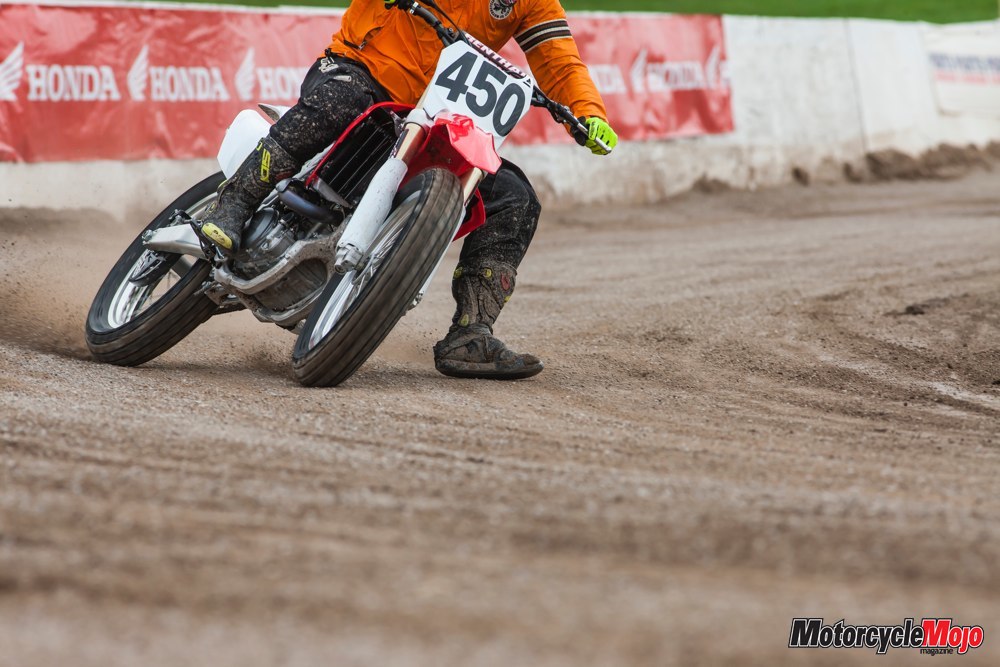 Honda is a sponsor of Flat Track Canada, and it supplied the new 2016 CRF150R, 250R and 450Rs that were available to ride. The bikes are slightly modified for dirt track use by changing the front wheel to 19-inch, which is devoid of any brake paraphernalia, changing and tuning the suspension on both ends and lowering the bike about 10 cm, and adding flat track specified rubber. There are brakes on the back end. The cost of the mods add about $1,300 to the price of the bike, so if you have an aging motocross bike kicking around, or find one at a decent price, you could get into flat-track racing at a very reasonable cost.
