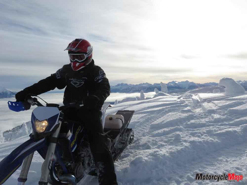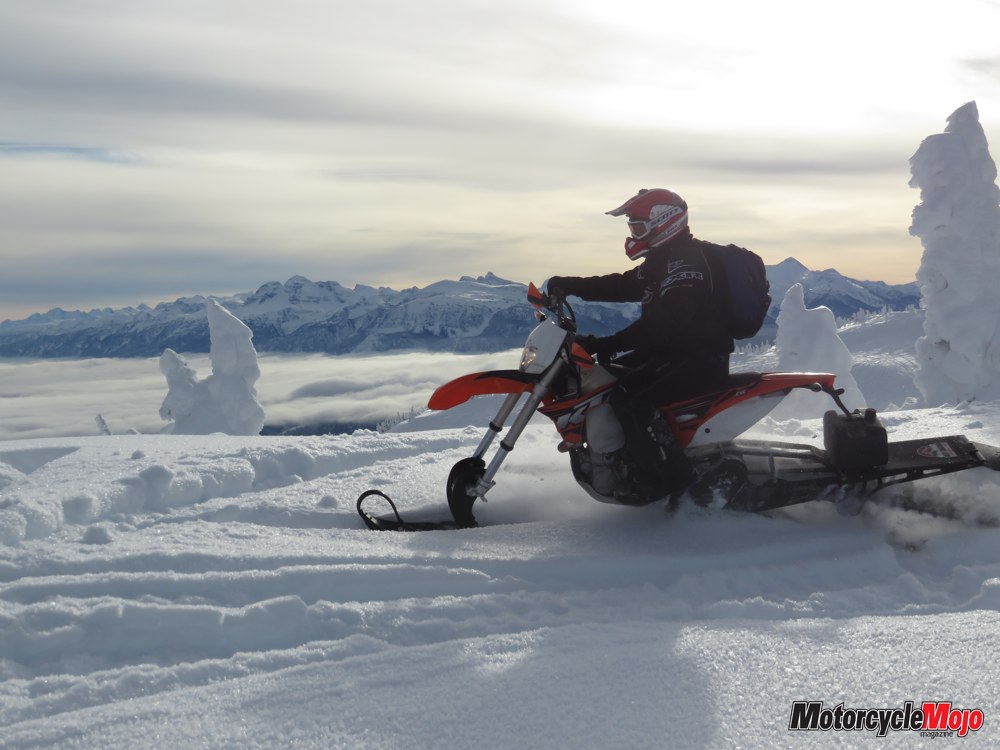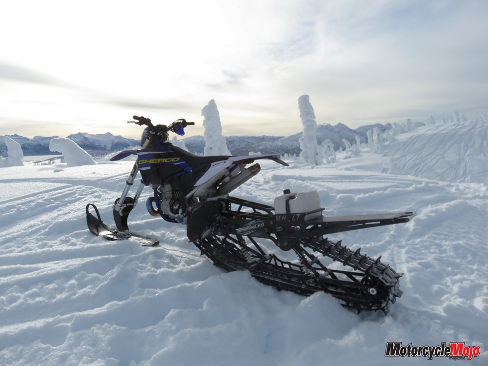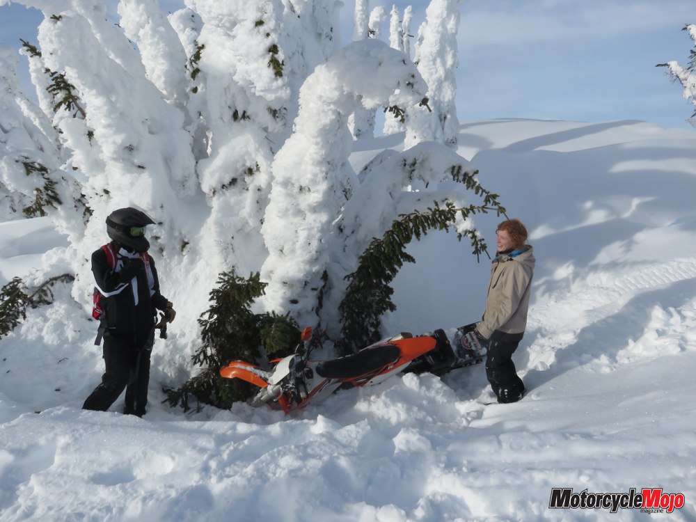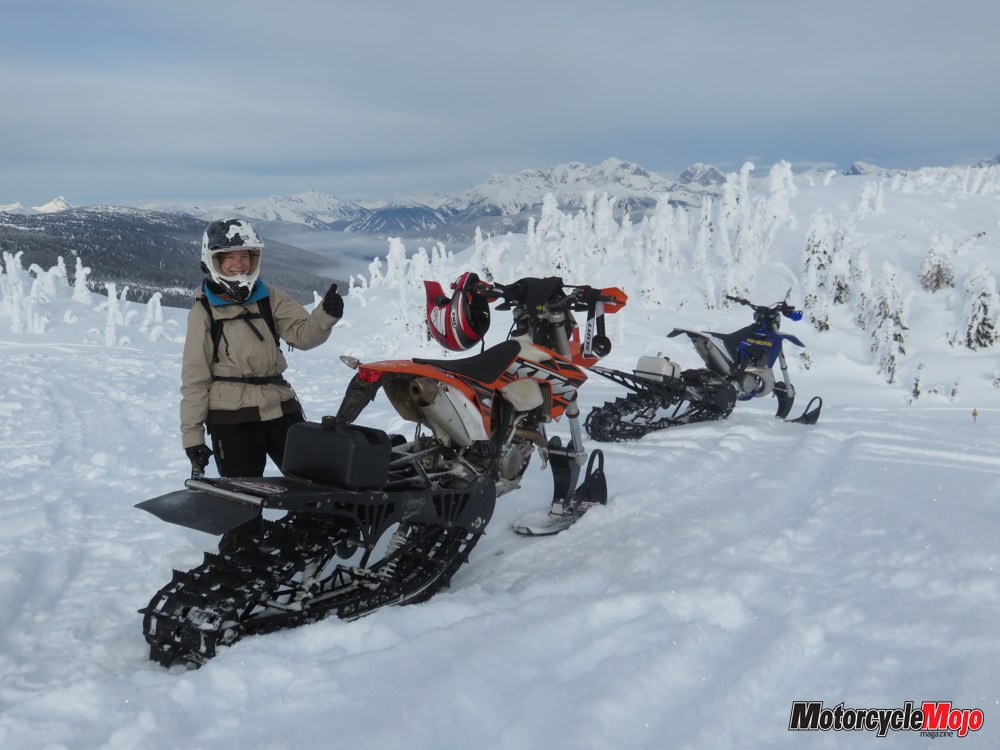 House Resort, which operates Great Canadian Snowmobile Tours. During the winter months, she looks after renting out the company’s two-dozen mountain sleds and accompanying clothing. Luckily, Daniel, her boss, owns a KTM-outfitted snow bike: most of the time I was on his KTM 500EXC, while Emily spent her time on a two-stroke Sherco 300SE-R that we rented from Infinite Powersports, just up the road from Glacier House. Both of the bikes’ conversion kits are manufactured by Idaho-based company Timbersled, which is why these snow bikes are commonly referred to simply as Timbersleds.