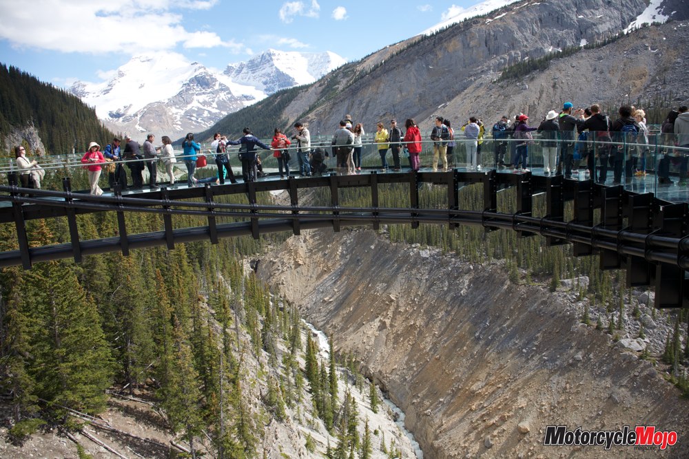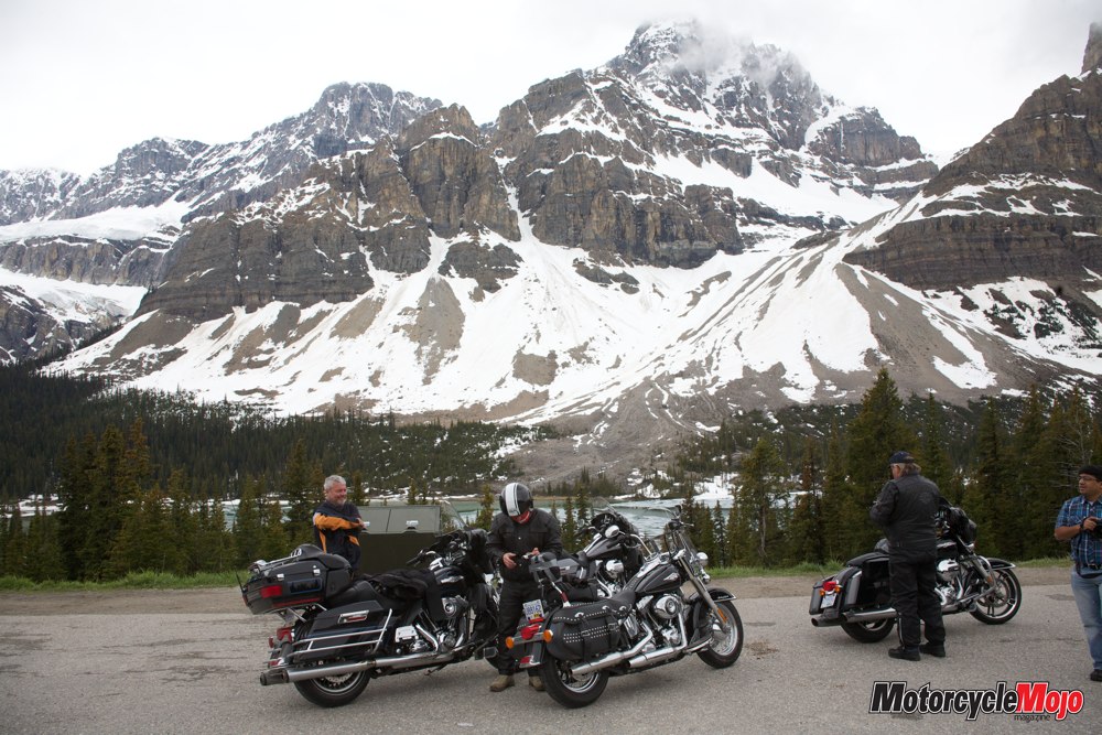 Although damp and cold at 5 degrees, the forecast promised clearing skies for our morning run up the Icefields Parkway through Banff and Jasper National Parks. If there were animals to be seen the day before, we missed them, but we would see wildlife on our ride up the parkway. First was a black bear standing on the opposite side of the road. As the last bike passed, the bear ran between it and the EagleRider truck and trailer driven by Al Perrett, owner of Kamloops H-D. Al locked up the brakes, and it was quite a sight in our mirrors to see the trailer trying to pass the truck. Due to the excitement and everyone looking in their mirrors, we almost had a motorcycle pile-up as well. Shorts checked, we continued on our way. It was a good reminder that while animals can be dangerous, people can be more dangerous (I’ve seen cars stopped in live lanes, with doors wide open as the people excitedly spilled out in an attempt to get too close to wildlife).