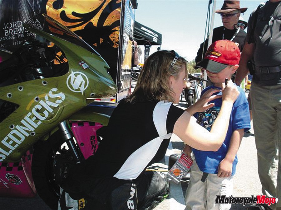 “I want to thank you for your courtesy and kindness in the time you spent talking with my daughter and her friend at last week’s Cal speedway practice day. It was a big deal for the girls to see a woman riding competitively and they wanted to meet you. I know that when at the track you are working but the graciousness you showed in taking the time for an autograph (the helmet), a picture (on your bike no less) and a chat meant a lot. You now have three more fans. Keep it up. Hope to see you on the podium one day soon.”