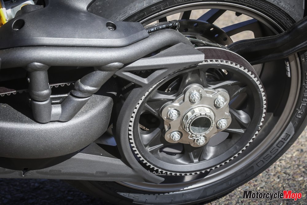 An All-New Diavel Despite its name linking it to the Diavel, the XDiavel is all new, sharing only calipers and tires with its muscle-bike stable mate. It has a 25 mm longer wheelbase (at 1615 mm), a 15 mm lower seat (at 755 mm) and two degrees more rake than the Diavel. Common on a typical cruiser but an all-new feature for a Ducati is belt final drive.