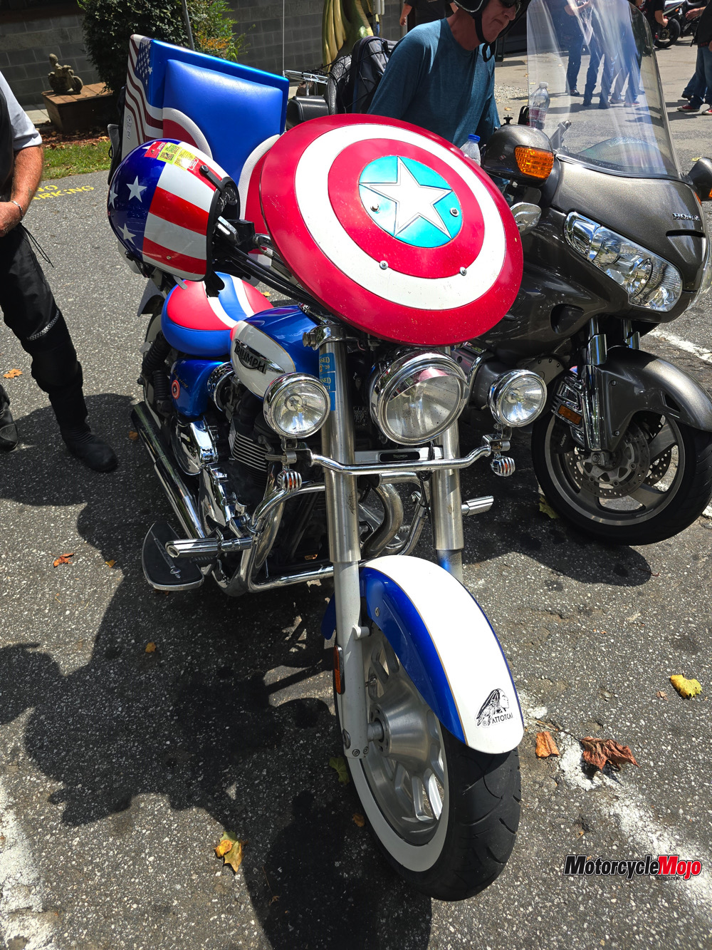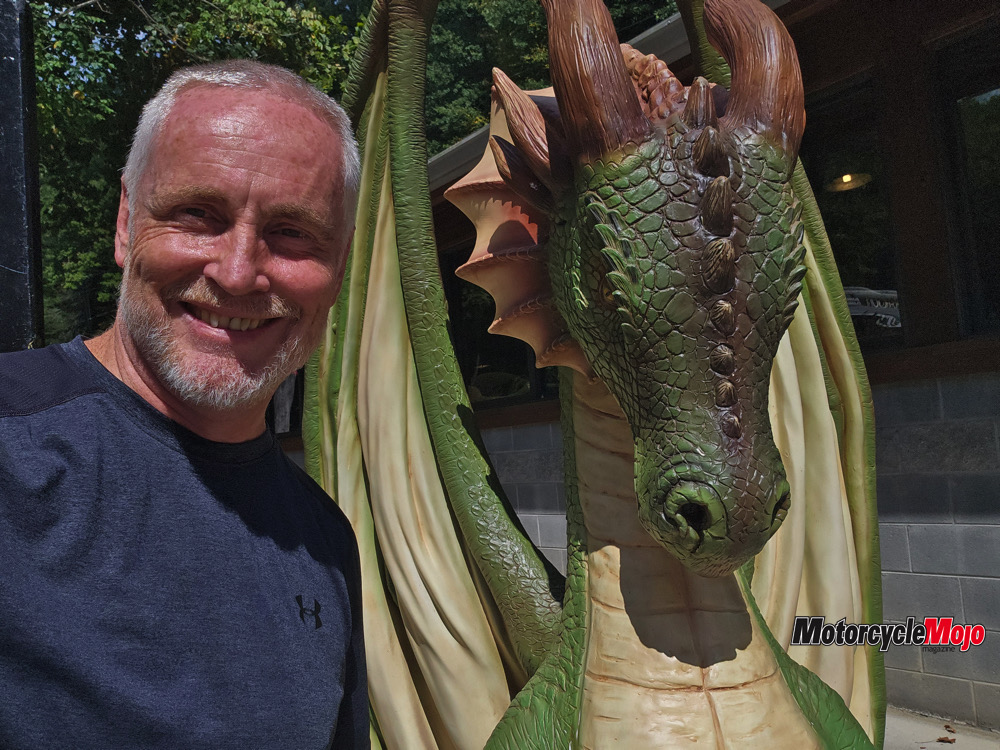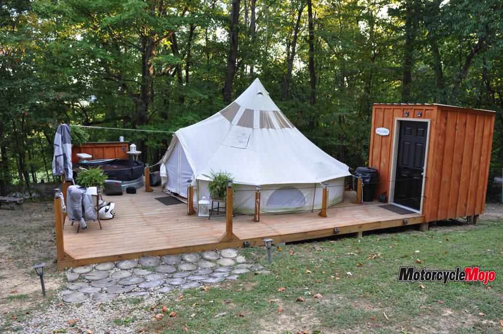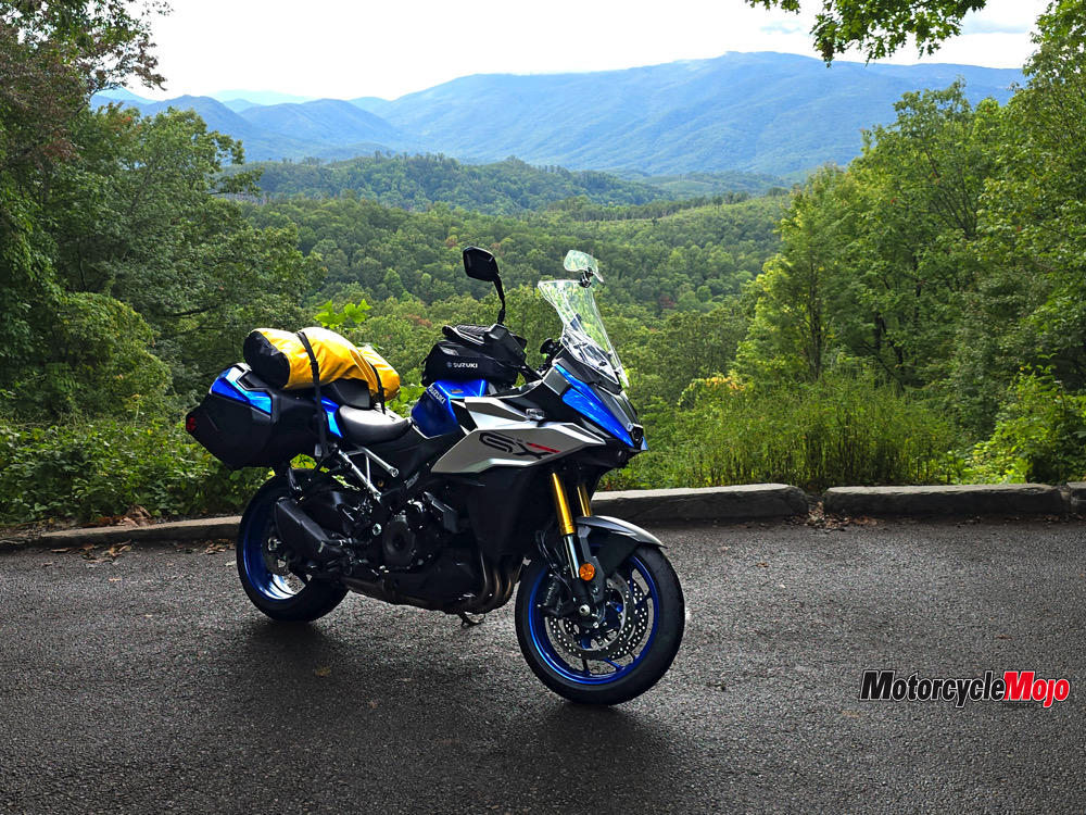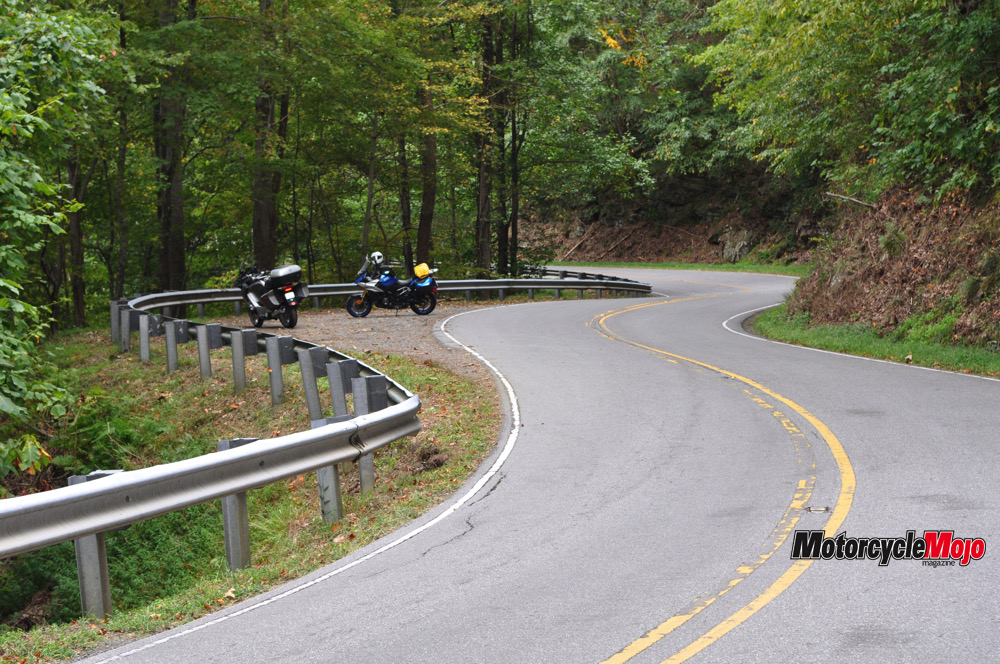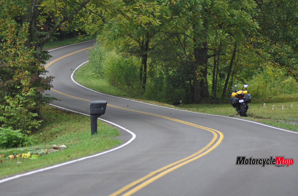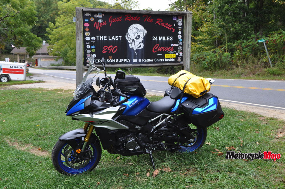 West Virginia. Laneways descended at impossible angles and when my GPS led us to the wrong property, we faced railway-style gravel, loose and freshly laid. It was a little hair-raising. And not entirely successful. I lost traction and dropped my new Suzuki GSX-S1000 GX — not the best way to start a test ride. Nevertheless, after a few deep breaths, we got Gigi righted, dusted her off, and found our glamping bell tent, complete with minifridge, barbecue, hot tub, and s’mores. I began to feel better. Propping the GX and Gary’s 2012 BMW R1200 RT at the bottom of the hill, we sat on the deck listening to cricket song as the night sky emerged like a real-world planetarium.