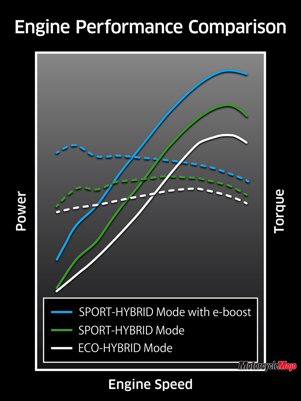 If the numbers aren’t all that impressive, the packaging of the disparate powertrains is. To maintain as much weight close to the centre of mass as possible, the electric motor, for instance, is mounted right behind the ICE’s cylinders. The area that traditionally would house a set of carburetor or throttle bodies is now filled with a liquid-cooled, permanent-magnet electric motor.