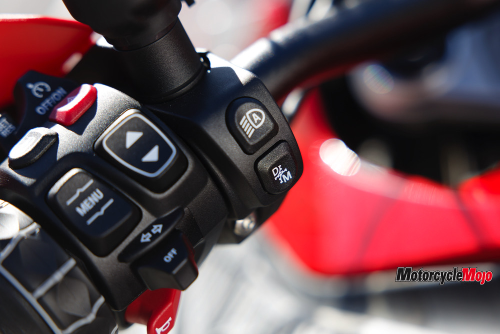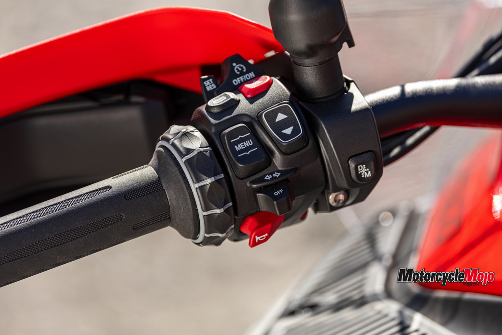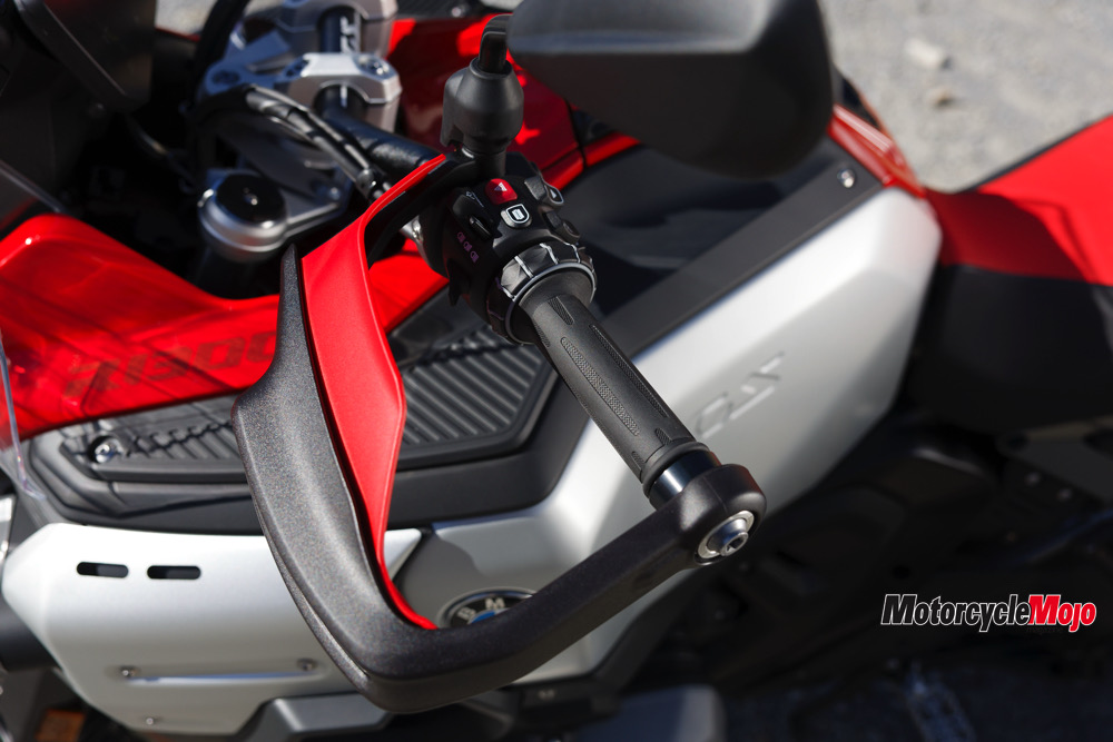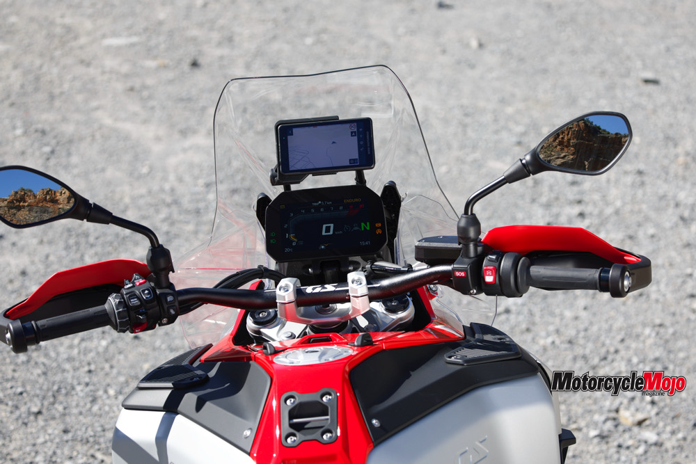 The list of standard and optional electronic aids is long. It includes traction control, fully integral ABS, four standard (Rain, Road, Eco, and Enduro) and three optional (Dynamic, Dynamic Pro, Enduro Pro) ride modes, hill start assist, engine braking control, adaptive cruise control with brake function, tire pressure monitoring, keyless ignition, and automatic emergency calling. Heated grips, a phone charging compartment with USB socket, and a 12-volt power socket are standard; heated seats for rider and passenger are optional.