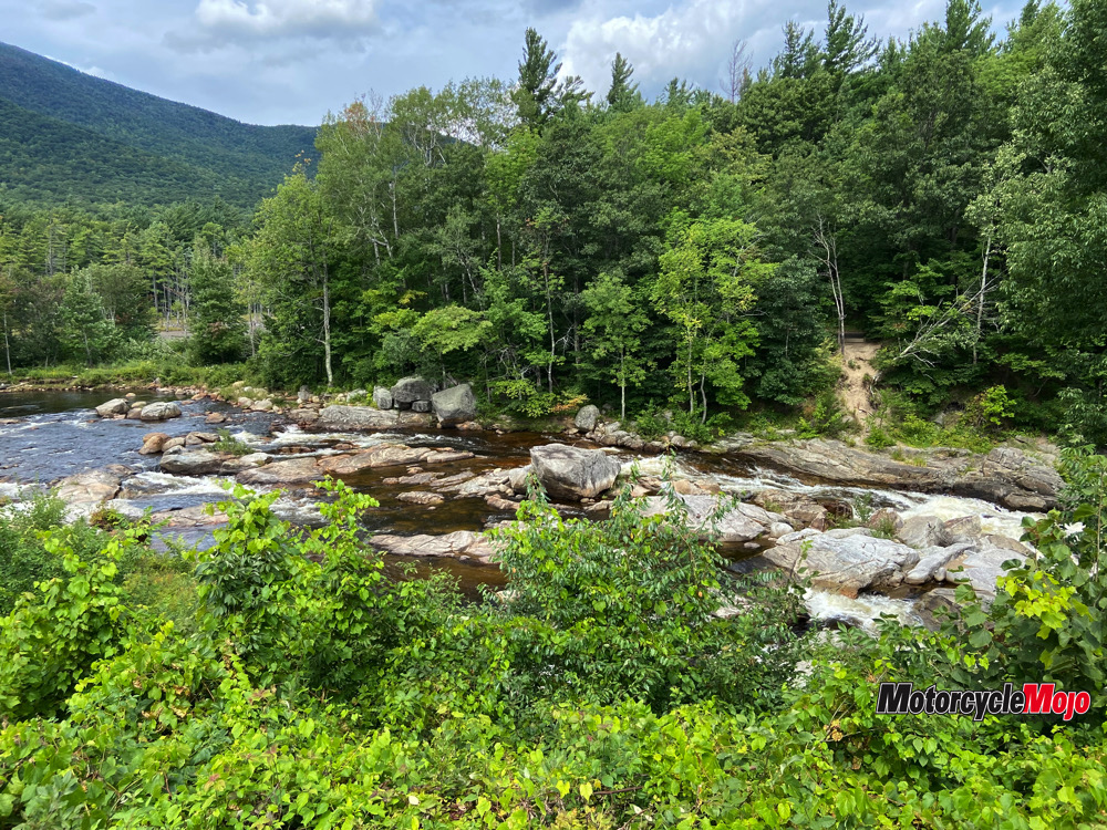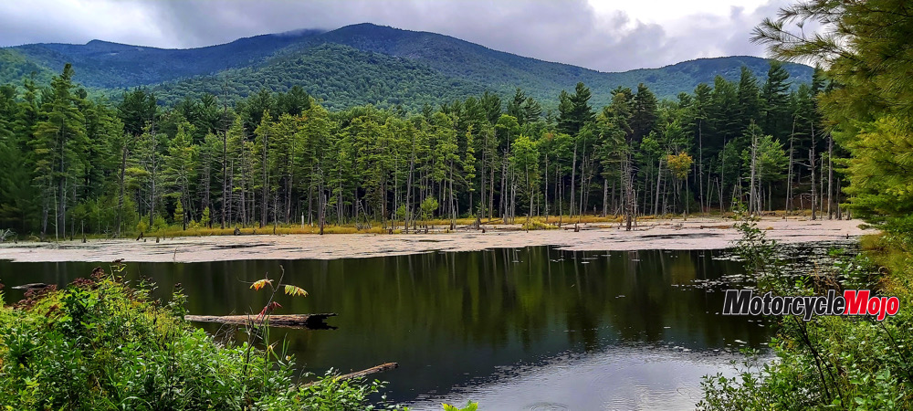 We sped south on Route 30, entering the Adirondack region on the way to the hamlet of Paul Smiths and then it was a cross-county route to Bloomingdale. We then encountered the best riding road of the day starting on the River Road (#48 also called the Franklin Falls Road), which winds its way through thick forest along the shore of the Saranac River to Franklin Pond.