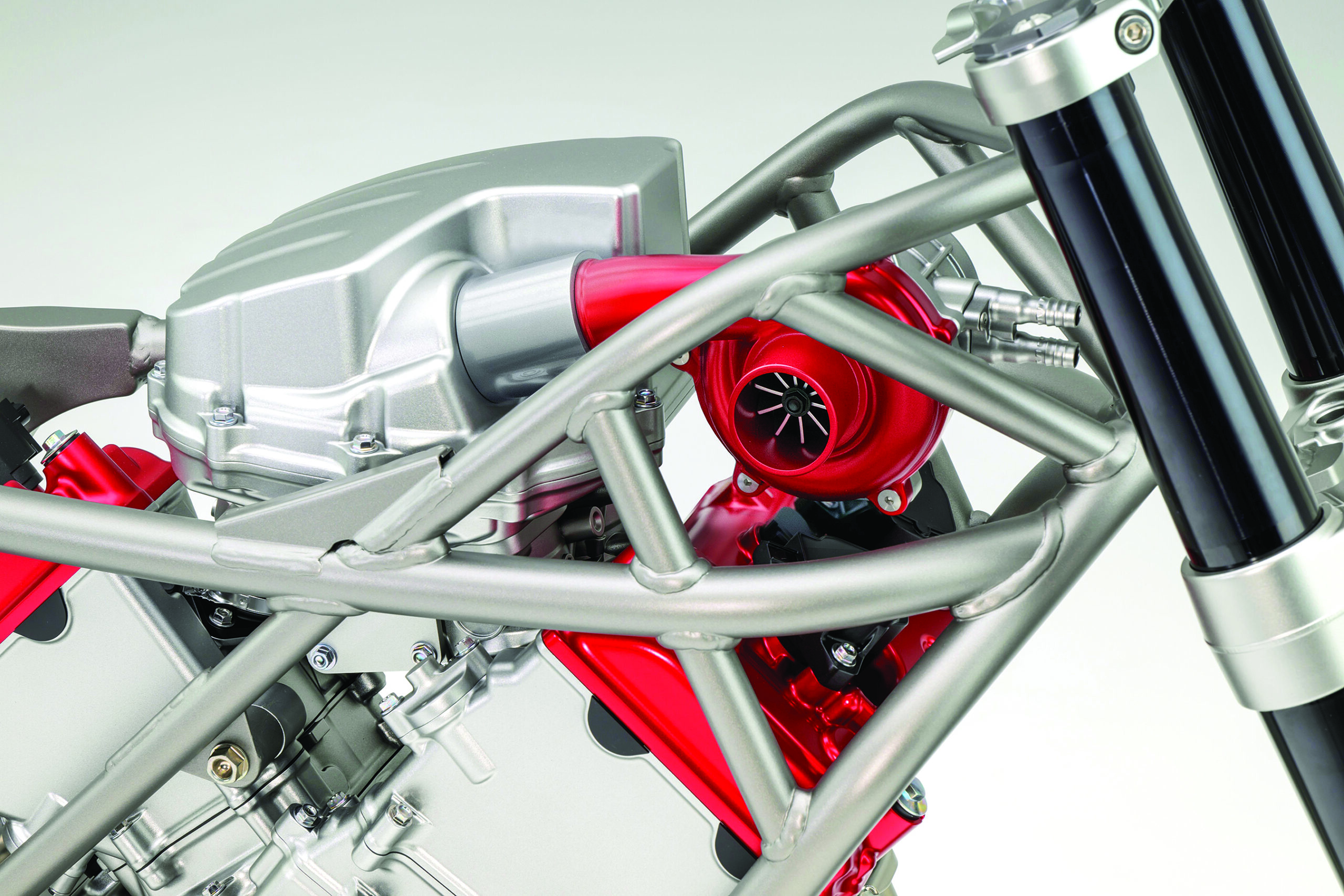 The latest bike-maker to talk of reintroducing turbocharging is Honda. While details are few, the concept shown at EICMA last November features a turbocharged 75-degree V3 of unknown displacement. Honda gets around turbo lag by powering the turbo by electricity. This puts little demand on the engine, while allowing the turbo to spool up via ECU programming. The technology has already been used in F1, and on the road by Audi and Mercedes-AMG. The drawback is that cars use a 48-volt system to power the turbos. The smaller size of the Honda turbo will likely require more conventional 12-volt power, making it a possibility in the near future.