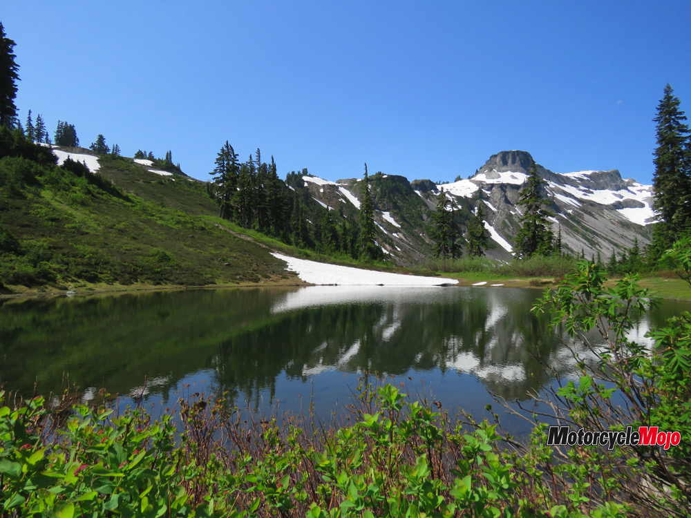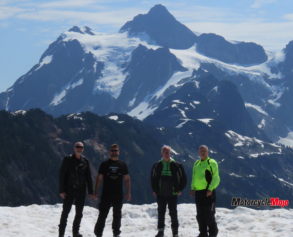This is not a road for the novice rider as it’s ripe with frequent switchbacks of 10 to 15 mph turns. The trees become shorter and farther apart with rising elevation, which improves the visibility. We took advantage of some parking areas on the way up to get commemorative photos of the trip. The last parking lot was surrounded by snow even though we were in the second week of July.