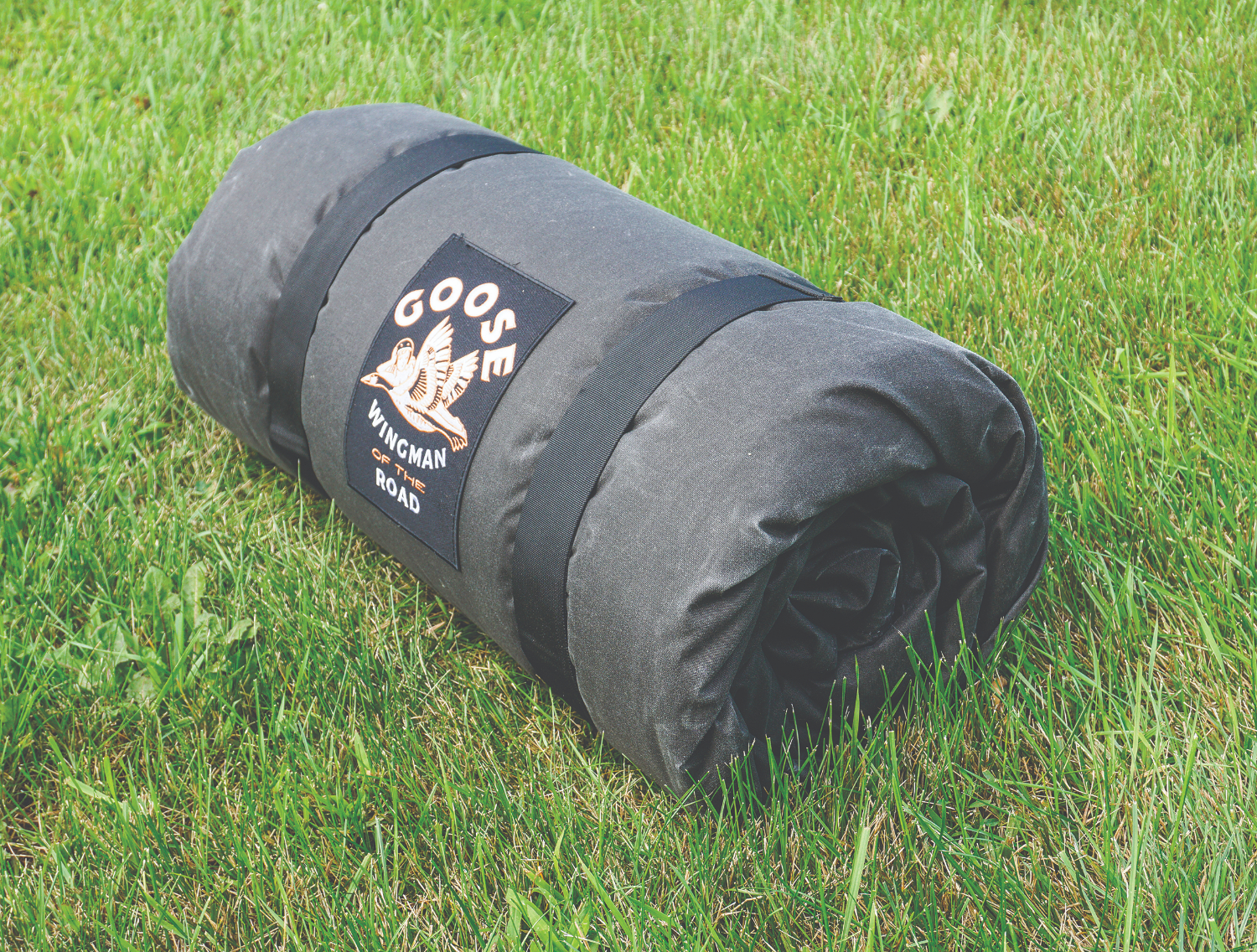 There is plenty of room for sleeping without feeling claustrophobic. There isn’t enough room to sit up but there doesn’t need to be. You’re just inside to get out of the elements and to sleep. The three centimetre thick, high-density foam mattress fills the floor from end to end and side to side, and the sleeping bag is summer-light. Both the mattress cover and the sleeping bag are zipped together, and the mattress can be removed for throwing the fabric in the washing machine. If you’re camping in chilly temperatures, you’ll want to be wearing a base layer and/or an additional blanket or heavier sleeping bag, which can also be rolled up in the Goose. That will, of course, make the rolled diameter larger but the outer straps are plenty long to accommodate. It’s still just one handy package to strap onto your bike.