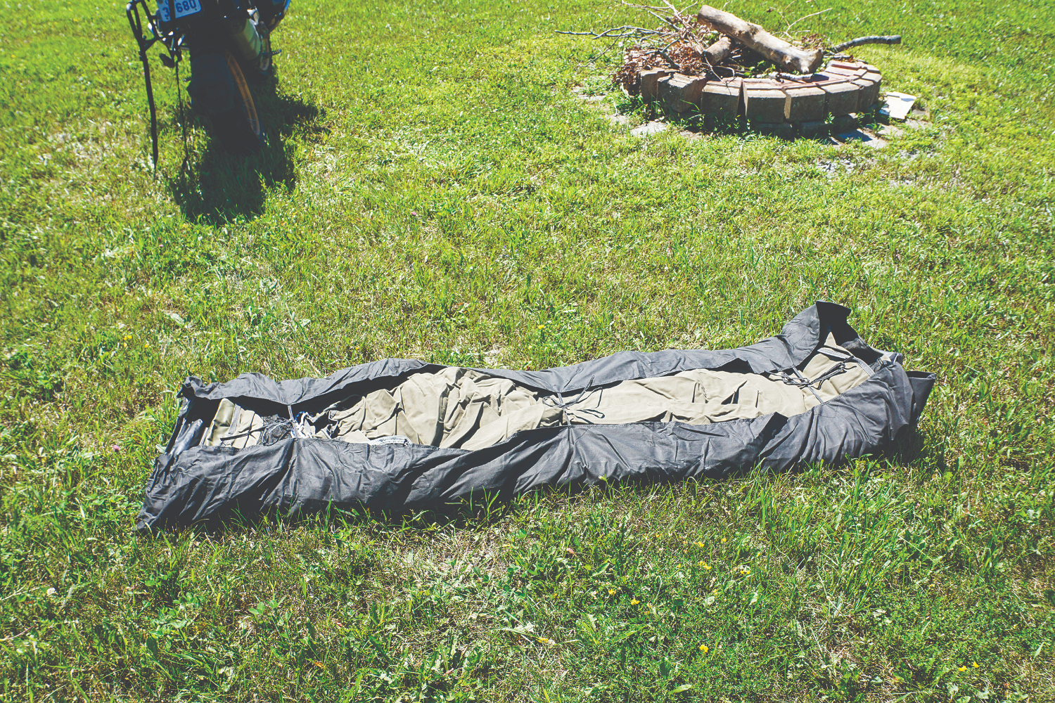 What could be construed as the main side of the tent has an additional extra-wide flap, or wing, and is designed to be tied to your bike. This “wing” acts as rain protection to cover the outer floor and your riding gear and/or panniers, which fit nicely in the area to keep them out of the elements. Ties on the floor can be also tied to your wheels to keep it in place. I slipped the other side of the floor under the tent to keep it in place.