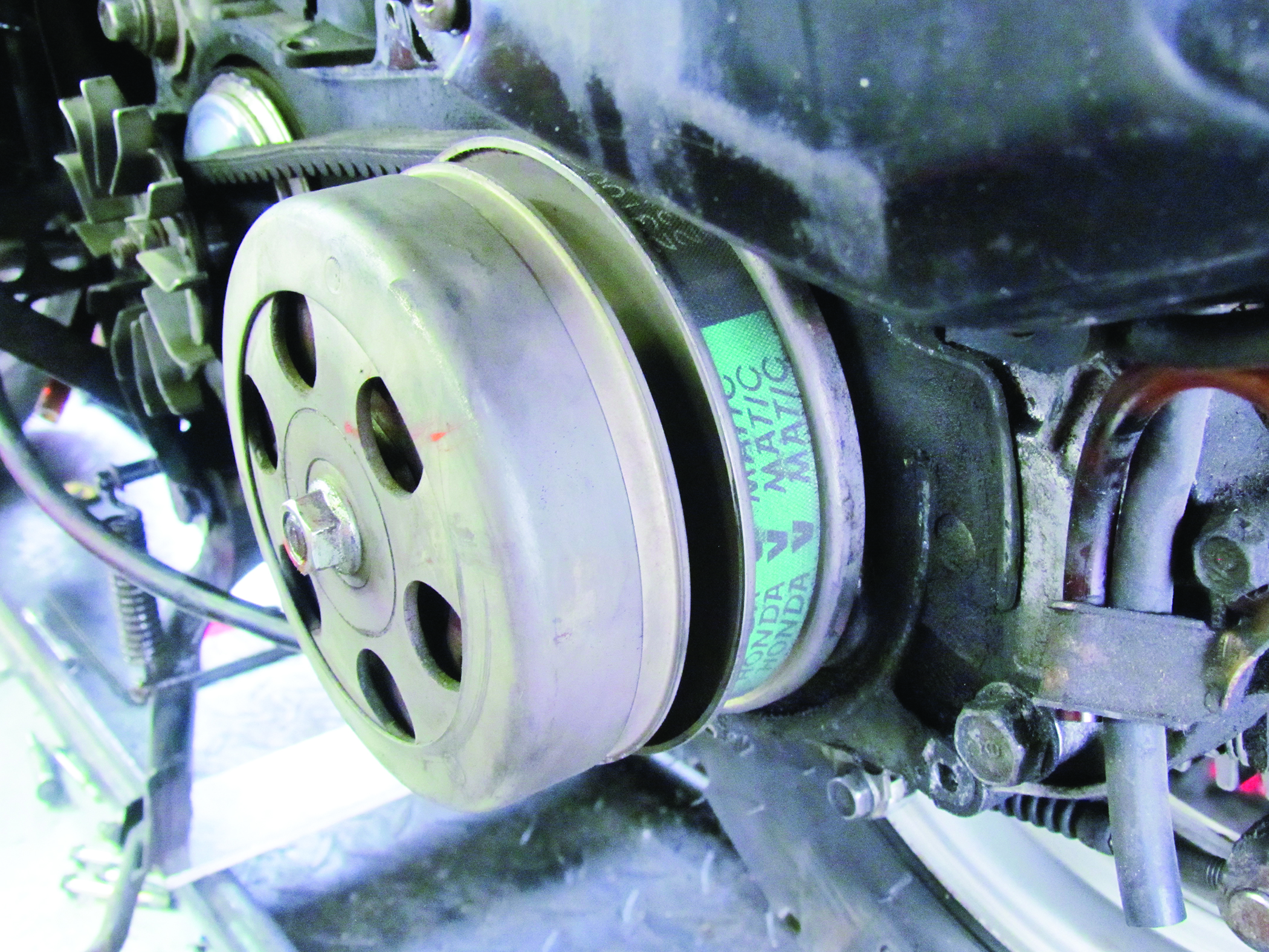 Alternately, the driven pulley’s moveable face is spring-loaded, and it is pushed outward by the drive belt. This system is fully automatic; if you’re running at top speed with the pulleys in their lowest ratio (highest gear) and begin climbing a hill, you will begin to lose speed. This reduction in speed will lower the centrifugal effect on the drive pulley’s steel balls, causing them to move toward the centre, and spreading the pulley’s faces apart.