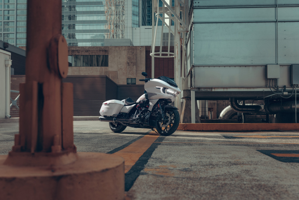 The Road Glide ST will be offered in two paint options, Golden White Pearl or Raven Metallic. The eagle graphic takes inspiration from the Screamin Eagle factory motorcycles that raced in the MotoAmerica Mission King of the Baggers series.