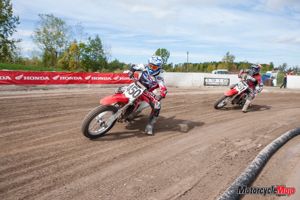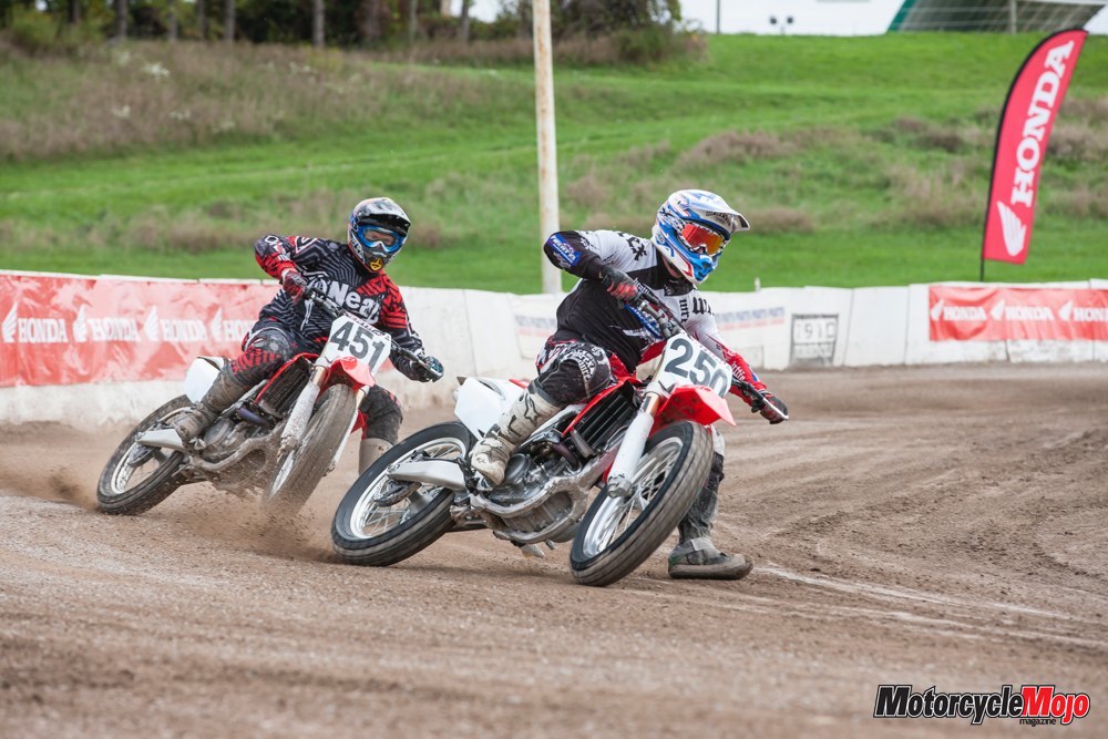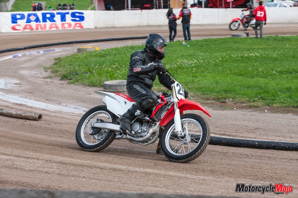Honda is a sponsor of Flat Track Canada, and it supplied the new 2016 CRF150R, 250R and 450Rs that were available to ride. The bikes are slightly modified for dirt track use by changing the front wheel to 19-inch, which is devoid of any brake paraphernalia, changing and tuning the suspension on both ends and lowering the bike about 10 cm, and adding flat track specified rubber. There are brakes on the back end. The cost of the mods add about $1,300 to the price of the bike, so if you have an aging motocross bike kicking around, or find one at a decent price, you could get into flat-track racing at a very reasonable cost.