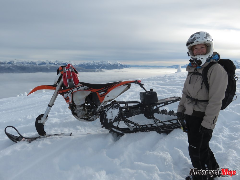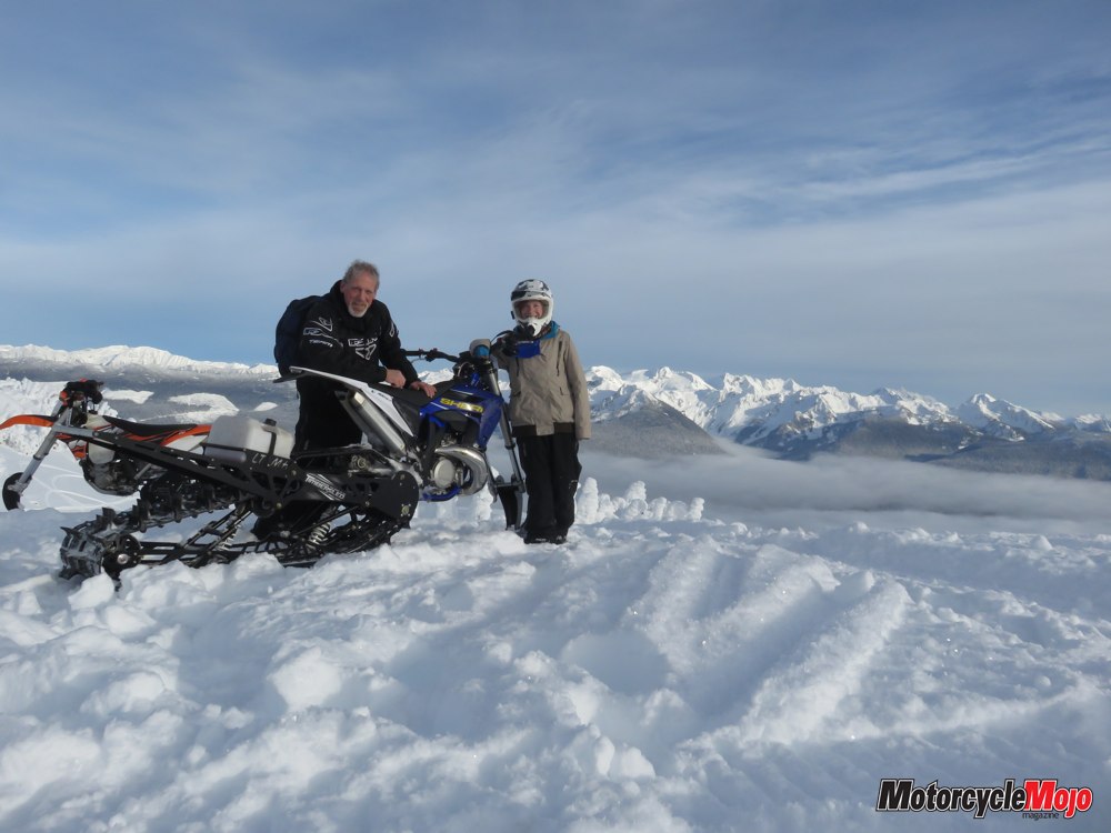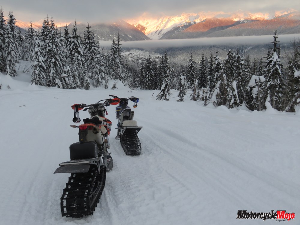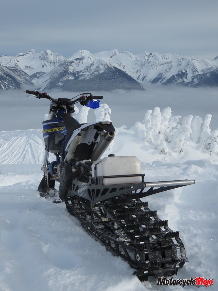 House Resort, which operates Great Canadian Snowmobile Tours. During the winter months, she looks after renting out the company’s two-dozen mountain sleds and accompanying clothing. Luckily, Daniel, her boss, owns a KTM-outfitted snow bike: most of the time I was on his KTM 500EXC, while Emily spent her time on a two-stroke Sherco 300SE-R that we rented from Infinite Powersports, just up the road from Glacier House. Both of the bikes’ conversion kits are manufactured by Idaho-based company Timbersled, which is why these snow bikes are commonly referred to simply as Timbersleds.
