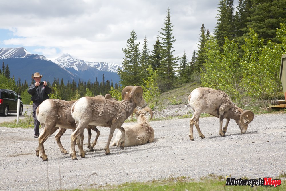 Although damp and cold at 5 degrees, the forecast promised clearing skies for our morning run up the Icefields Parkway through Banff and Jasper National Parks. If there were animals to be seen the day before, we missed them, but we would see wildlife on our ride up the parkway. First was a black bear standing on the opposite side of the road. As the last bike passed, the bear ran between it and the EagleRider truck and trailer driven by Al Perrett, owner of Kamloops H-D. Al locked up the brakes, and it was quite a sight in our mirrors to see the trailer trying to pass the truck. Due to the excitement and everyone looking in their mirrors, we almost had a motorcycle pile-up as well. Shorts checked, we continued on our way. It was a good reminder that while animals can be dangerous, people can be more dangerous (I’ve seen cars stopped in live lanes, with doors wide open as the people excitedly spilled out in an attempt to get too close to wildlife).