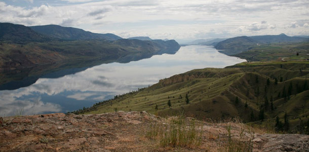 It was rainy and overcast as we headed east out of the city. We weren’t in any hurry and the skies looked brighter to the south, so we veered off on 97 (the Okanagan Highway) toward Vernon, seeking sunshine. British Columbia has a varied landscape, and the brown, sagebrush-covered hills of the Kamloops area soon gave way to steep, evergreen-forested hillsides and farmers’ fields, and more importantly, clearing skies. The long, sweeping downhill approaching the historic O’Keefe Ranch offered particularly scenic views.
