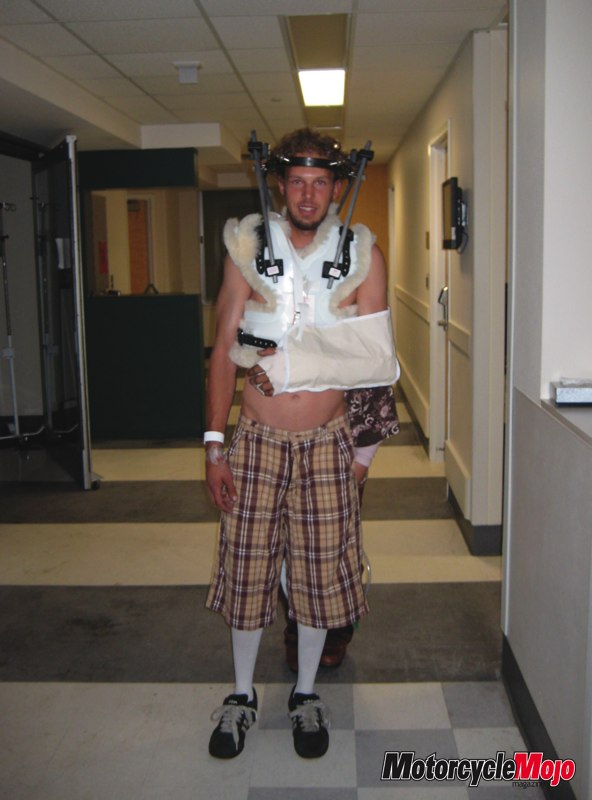 Josh had been wearing a size small helmet and by the time Bruce was done with him, he held a brand new XS Arai. It was this new helmet he was wearing when he crashed at Road Atlanta. After the crash, Josh got up and walked back to the pits with an obviously broken wrist and some neck pain. It was only later in the hospital that they found out that he had fractured the C2 vertebrae in his neck. Also known as a hangman’s fracture, this type of break in the neck could have easily resulted in full or partial paralysis. Galster was fitted with a halo, which he has been wearing for the last two months, and will continue to wear for another month, before moving to a hard brace. He is expected to make a full recovery.