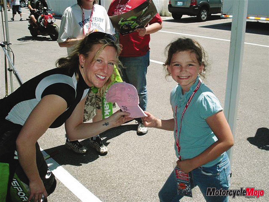 “I want to thank you for your courtesy and kindness in the time you spent talking with my daughter and her friend at last week’s Cal speedway practice day. It was a big deal for the girls to see a woman riding competitively and they wanted to meet you. I know that when at the track you are working but the graciousness you showed in taking the time for an autograph (the helmet), a picture (on your bike no less) and a chat meant a lot. You now have three more fans. Keep it up. Hope to see you on the podium one day soon.”