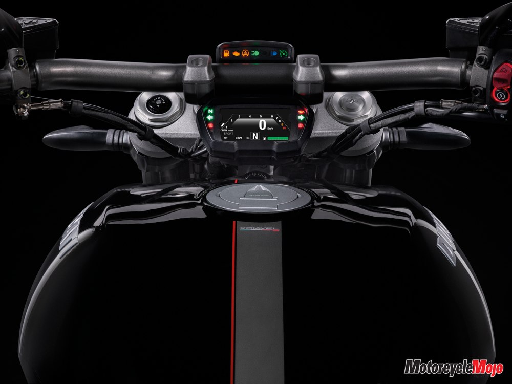 XDiavel EngineIts Testastretta DVT (with variable valve timing) is an all-new variation of the Multistrada’s engine, stroked to 1262 cc from 1198 cc, and redesigned with no external coolant hoses between the heads for improved aesthetics. It’s also retuned to produce much more bottom-end torque. Despite producing slightly less peak torque than the Diavel, it reaches its maximum of