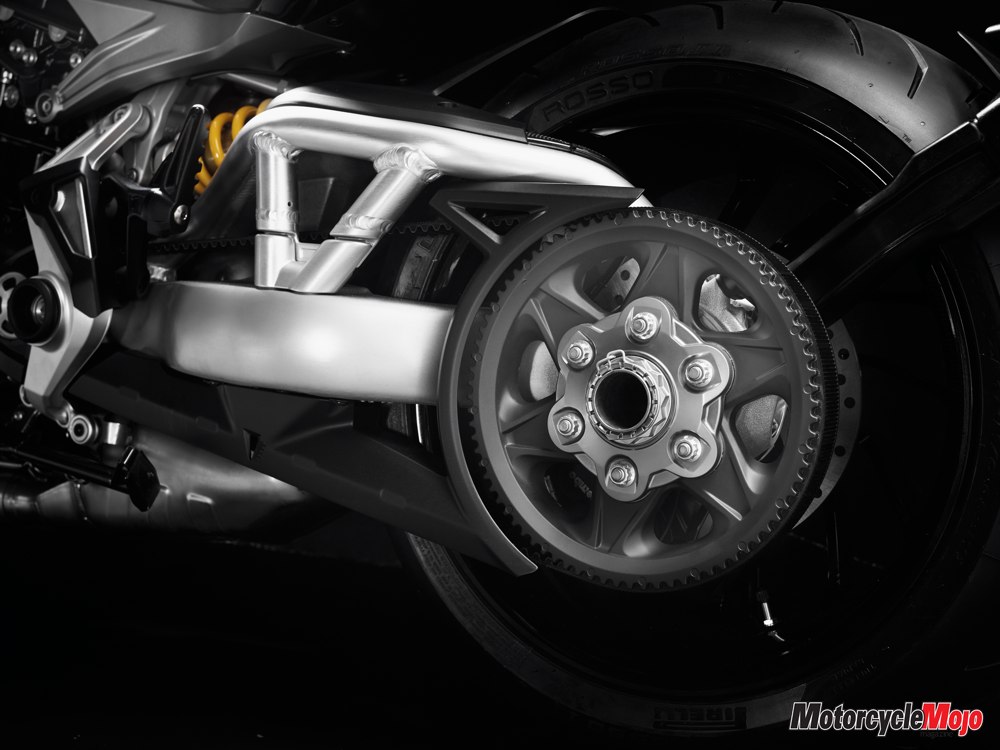 An All-New Diavel Despite its name linking it to the Diavel, the XDiavel is all new, sharing only calipers and tires with its muscle-bike stable mate. It has a 25 mm longer wheelbase (at 1615 mm), a 15 mm lower seat (at 755 mm) and two degrees more rake than the Diavel. Common on a typical cruiser but an all-new feature for a Ducati is belt final drive.
