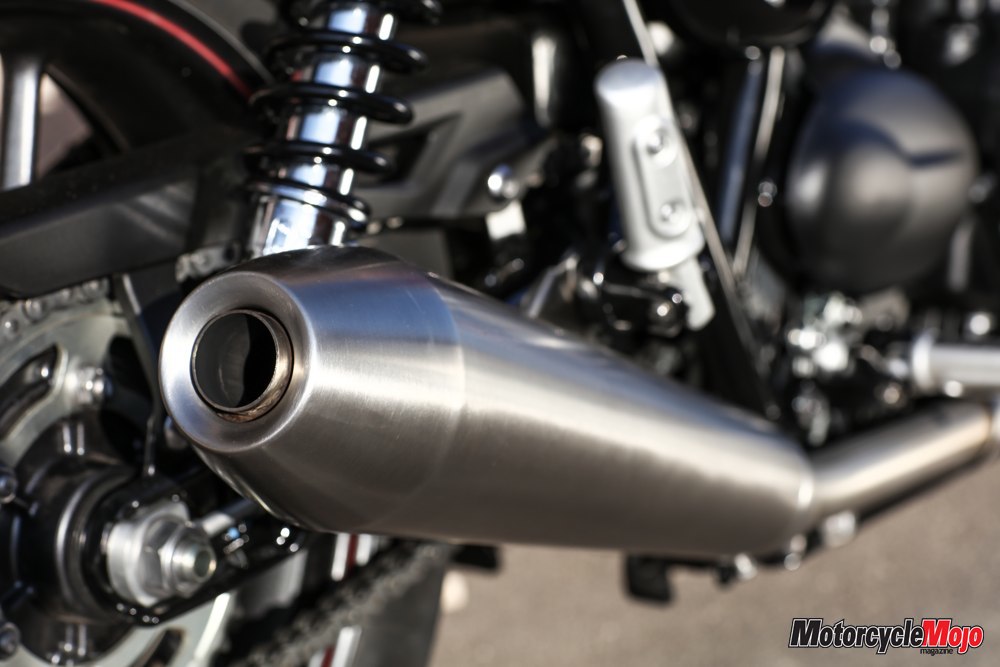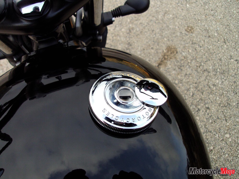 Once fired, the engine emits a classic, deep rumble out the tailpipes, and a more contemporary whirring of balancer chains. The clutch is beginner-bike light, and a gentle, downward nudge at the shifter gets the bike into first gear. With its surprisingly tall first gear, I had to ride the clutch a bit to get moving, though the engine’s high torque output makes taking off from a stop a breeze. The gearbox is light and precise, each successive gear change requiring a very short, light tap on the shift lever.
