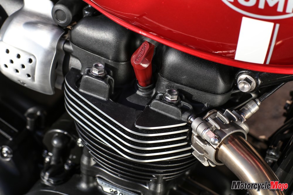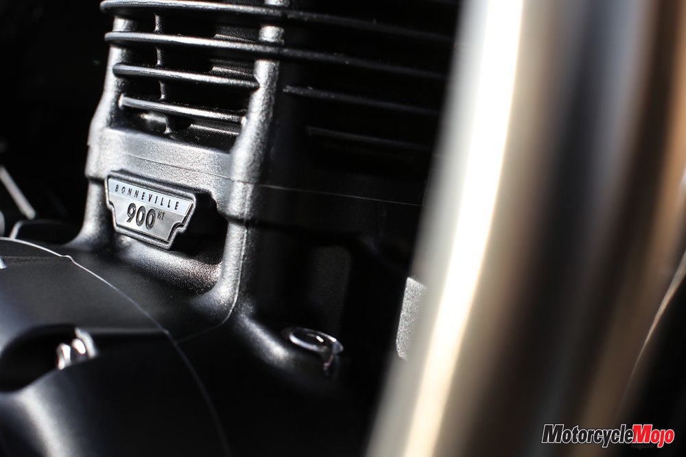 ation Bonneville range is the engine, which is liquid-cooled. The liquid cooling is very well disguised, with large, functional cooling fins still covering the head and cylinders, and a narrow radiator nestled between the front downtubes.
