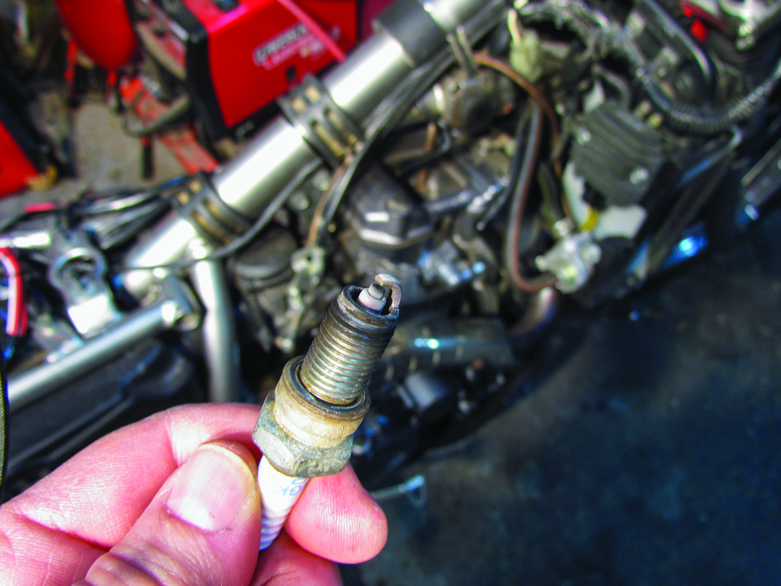 Sometimes spark plugs are easily accessible; sometimes body parts and fuel tanks must be removed to get at them (like on my KLR650). If a visual inspection reveals rounded electrodes, it’s time to change the plugs. Most spark plugs are pre-gapped, but check them anyway. You might want to upgrade to platinum- or iridium-tipped plugs; they’re more expensive but last much longer than regular plugs — definitely an advantage if you have to tear your bike apart to get to them.
