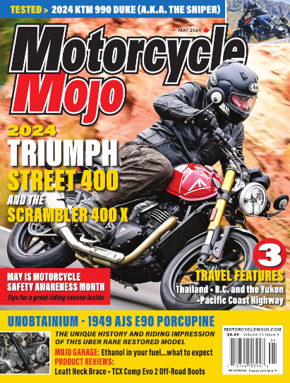 In this issue we bring you test rides on the brand new 2024 Triumph Street 400 and Scrambler 400 X, as well as the completely redesigned KTM 990 Duke. We feature an in-depth article about the uber rare 1949 AJS E90 Porcupine and how it will forever be in the history books. Our travel features include B.C. and the Yukon; the Pacific Coast Highway; and Thailand with an unlikely group of riding companions.