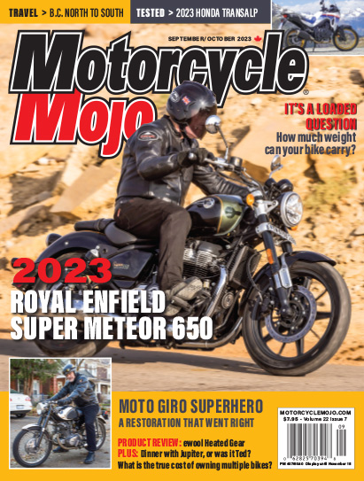 In this issue we bring you test rides of the 2023 Honda Transalp 750 and Royal Enfield’s Super Meteor 650s, as well as catching up with Ted Simon 50 years after he left on his epic round-the-world motorcycle odyssey that became the book Jupiter’s Travels. Our travel feature starts in Watson Lake, Yukon, heads south through B.C., and ends in B.C.’s Southern Interior.