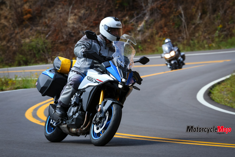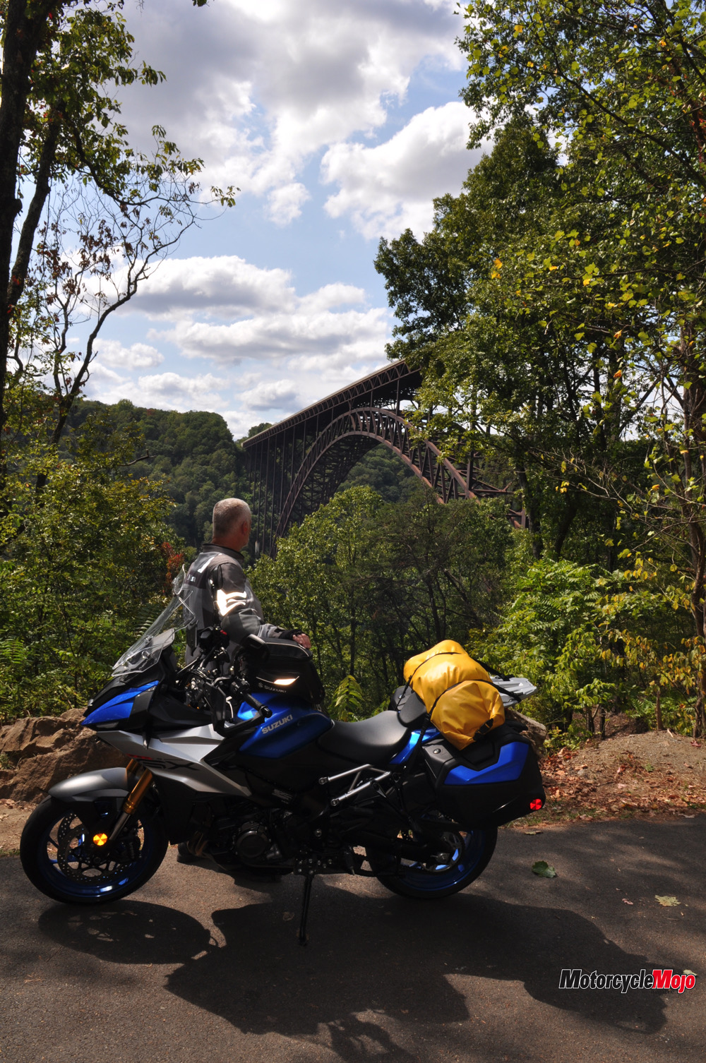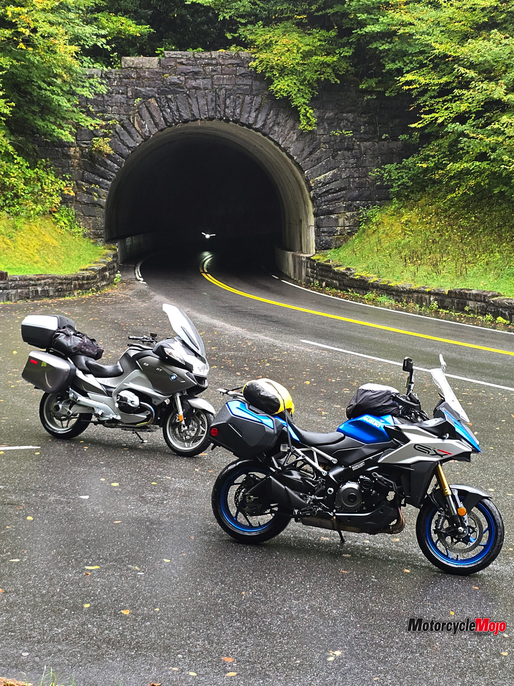 West Virginia. Laneways descended at impossible angles and when my GPS led us to the wrong property, we faced railway-style gravel, loose and freshly laid. It was a little hair-raising. And not entirely successful. I lost traction and dropped my new Suzuki GSX-S1000 GX — not the best way to start a test ride. Nevertheless, after a few deep breaths, we got Gigi righted, dusted her off, and found our glamping bell tent, complete with minifridge, barbecue, hot tub, and s’mores. I began to feel better. Propping the GX and Gary’s 2012 BMW R1200 RT at the bottom of the hill, we sat on the deck listening to cricket song as the night sky emerged like a real-world planetarium.