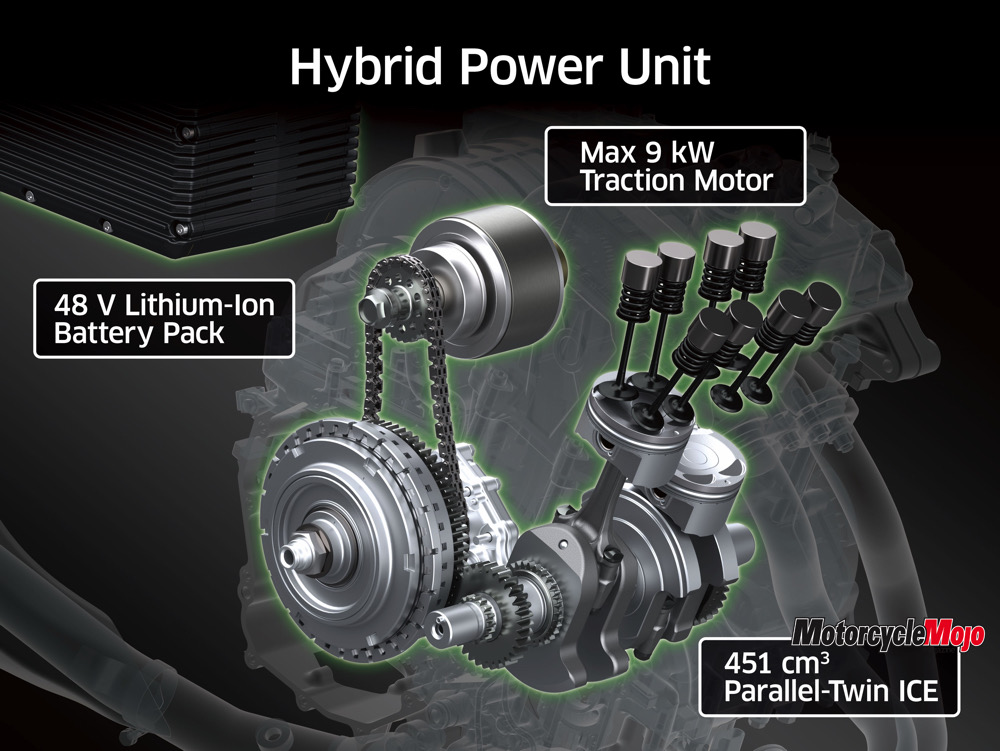 The individual components that make up the new Ninja 7 Hybrid’s powertrain are not auspicious. The gas-fed part of the equation, for instance, is a little 451-cc parallel twin liberated from the lowly — at least for something wearing such sporting bodywork — Eliminator cruiser. Oh, it’s been pumped up a bit with modified intake and exhaust systems, but it’s still only good for 58-horsepower (at just 10,500 rpm). Peak torque is a likewise measly 32 lb.-ft. at 7,500 rpm. Neither number is scintillating.