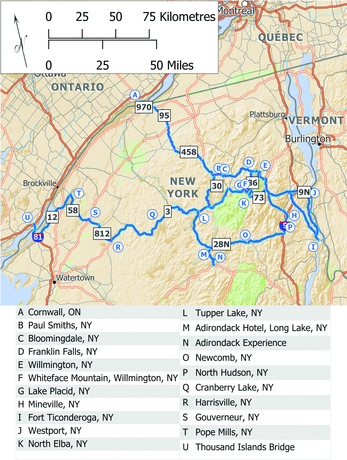 The Adirondacks and area would be our riding country for five days. That first day our intrepid band of adventurers had ridden the slow meandering roads from Kingston along the historic and scenic north St. Lawrence River heritage route to the Mohawk Akwesasne reserve border crossing at Cornwall on the way to our destination just north of Lake Placid.