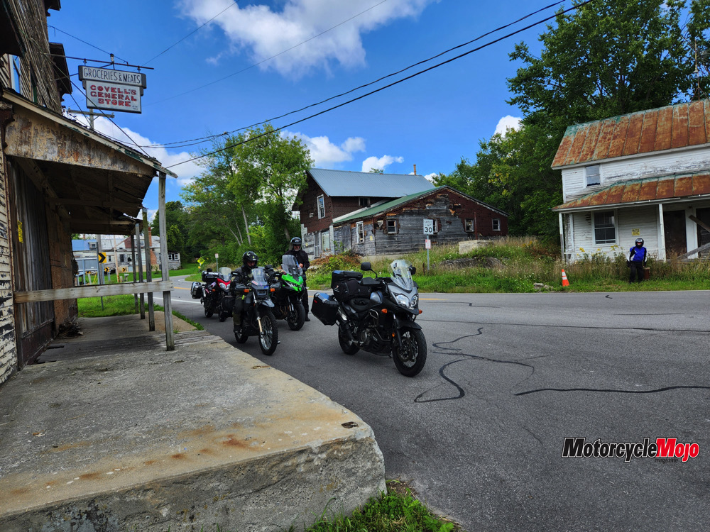 “Where are you going?” was the only question asked of me baking in the sun on my 2015 V-Strom 650. “Have you ever been convicted of a crime” was the question to John, sweating on his red 2015 V-Strom 650, while Dean on his 2020 Suzuki DR650 and Jim riding his 2022 Kawasaki Versys 1000 were waved through with the simple statement “Are you with them?” After filling up with cheap fuel on the American Mohawk Reserve, we swept past Fort Covington on our way to Malone for a stop at Price Chopper for supplies and the Jug Shop for liquid necessities.